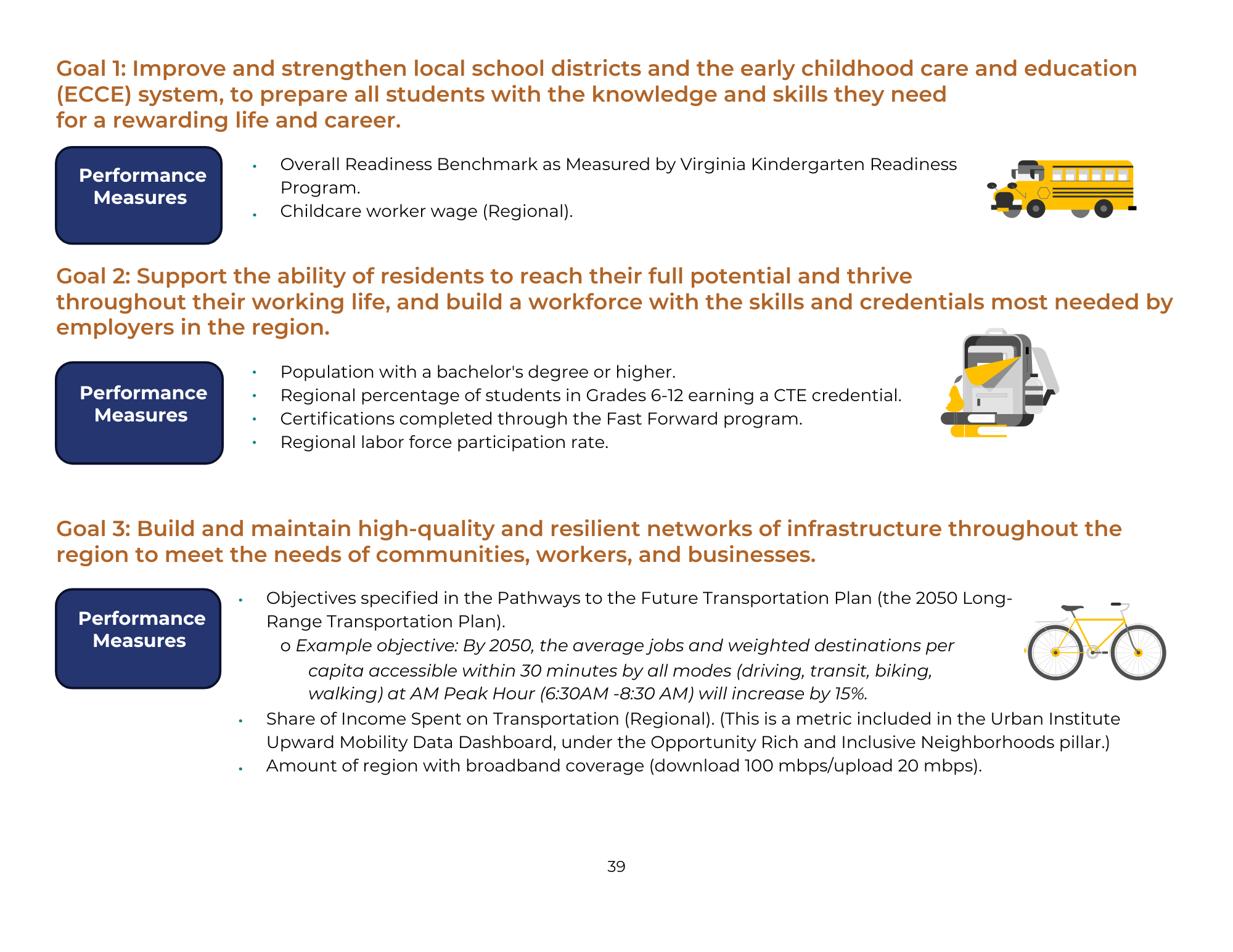 The steering committee considered goals and activities that can help the region maintain its strengths or address areas where improvement is needed.