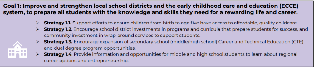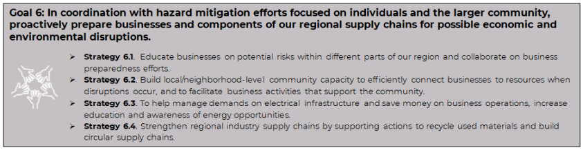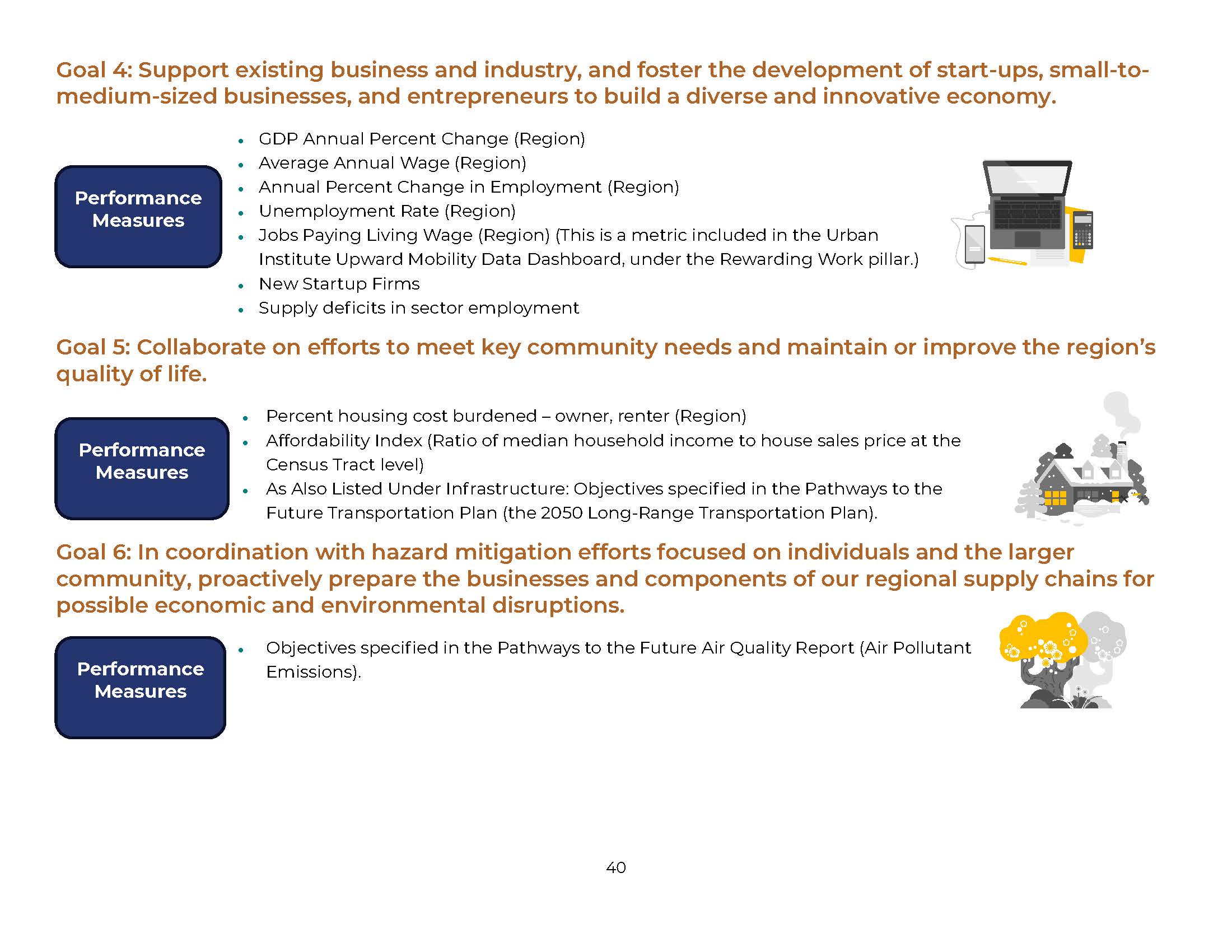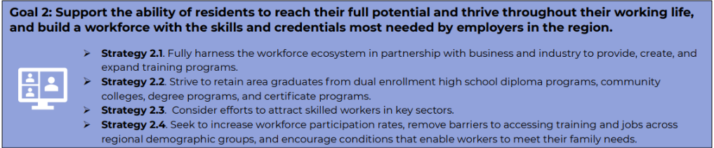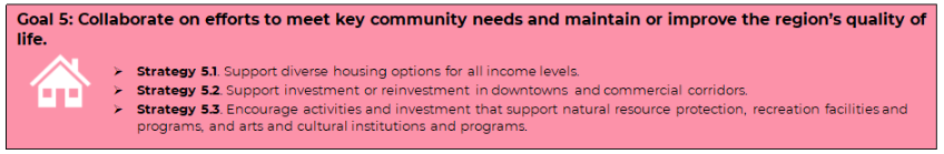 Intended to help the region safeguard strengths and address opportunities, here are 6 goals, with strategies of how to achieve them. These are in alignment with the Region's Strategic Plan.