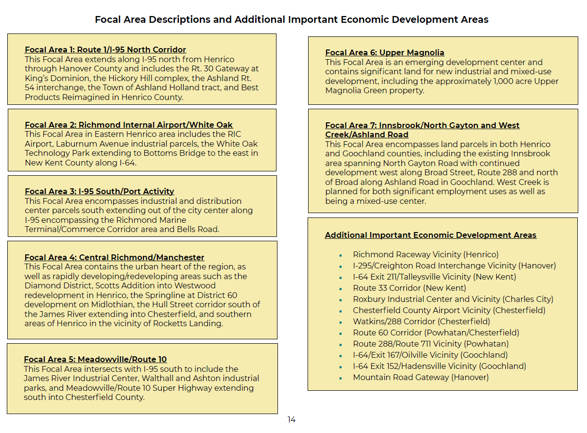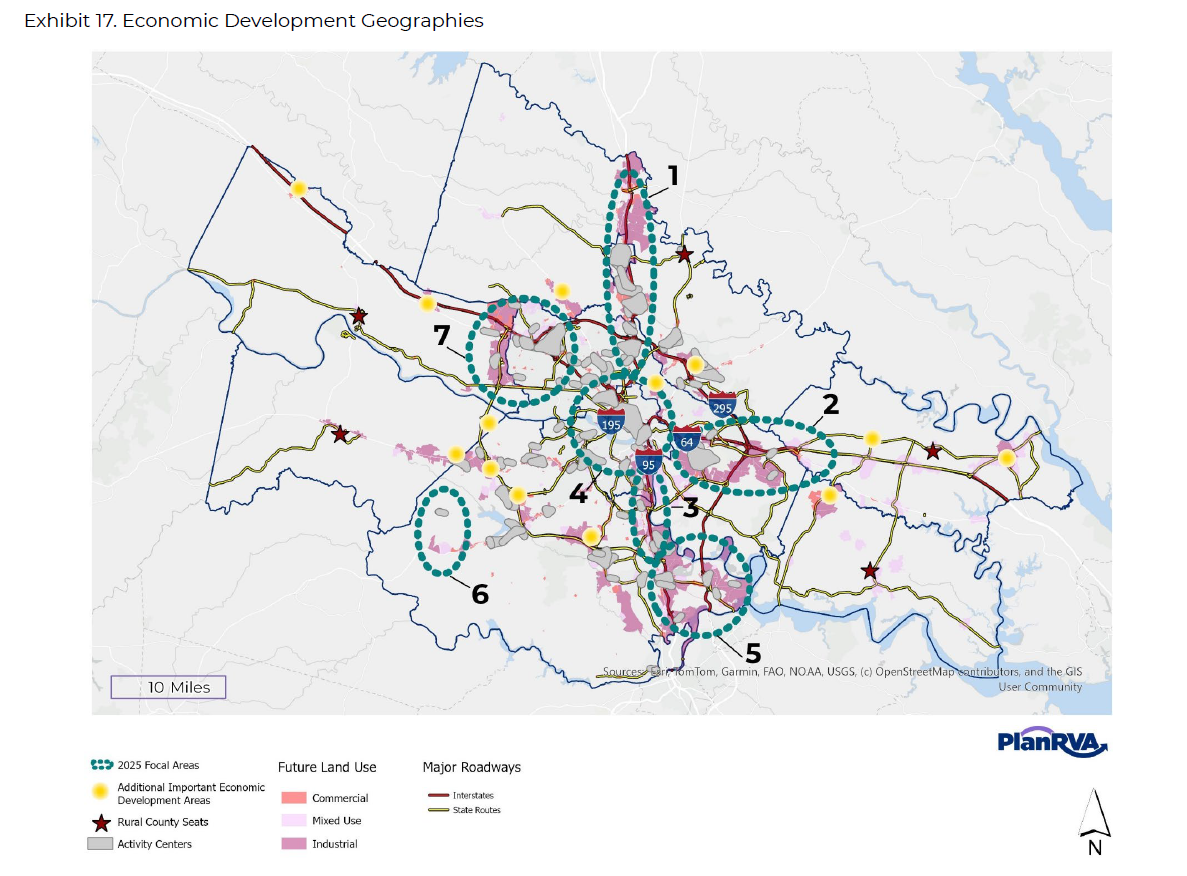 Activity Centers are existing and forecasted future nodes where concentrations of people work, live, or both. This, plus locality input were used to create a map that shows regional focal areas, as well as additional important economic development areas noted as current or likely nearer-term growth areas – see the map and descriptions below.