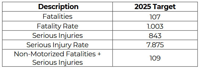For our 2025 safety goals, PlanRVA currently uses targets that are lower than those set by VDOT for the Richmond region . Our targets are displayed in the table below.
